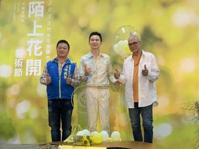 「2023竹北花田囍市–陌上花開藝術節」16日將登場,竹北市長鄭朝方(中)6日表示,市公所持續推動藝文平權,盼藉由陌上花開藝術節吸引民眾走進西區同時帶動觀光經濟效益。