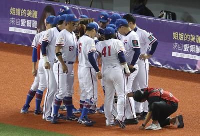 2023亞洲棒球錦標賽超級循環賽地主台灣隊首戰8日在台北大巨蛋交手日本隊,賽前台灣隊選手圍成一圈,集氣喊聲。