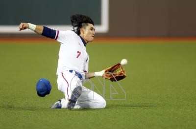 2023亞洲棒球錦標賽超級循環賽賽程在台北大巨蛋展開,台灣隊8日晚間對上日本隊,外野手陳文杰美技接殺飛球。