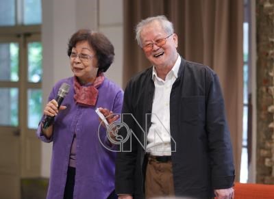 「撢亮星空的菅芒花:黃春明詩話撕畫」新書發表會15日下午在台北舉行,作家黃春明(右)和妻子林美音(左)出席,和與會者交流互動。