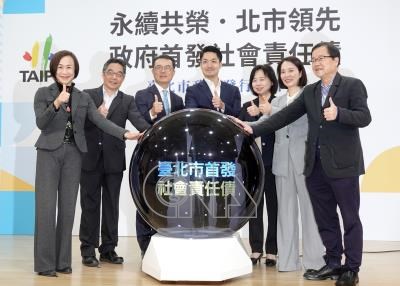 台北市長蔣萬安(左4)10日出席「永續共榮.北市領先-政府首發社會責任債」記者會,與北富銀總經理郭倍廷(左3)一起主持啟動儀式。