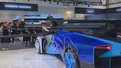 中國在CES主場館LVCC廠商僅有約百家。小鵬汽車子品牌飛天車在偌大汽車科技展區裡,被其他大廠包括韓國HD Hyundai、美國亞馬遜(Amazon)圍繞。攝於CES舉辦期間。