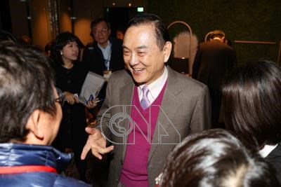 台灣玉山科技協會2023年歲末晚宴16日晚間在台北晶華酒店登場,鈺創科技董事長盧超群(中)出席,會前接受媒體聯訪。