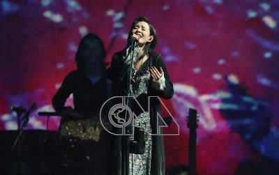 歌手安溥(前)3日晚間在台北小巨蛋舉行「時寐」演唱會,登台帶來「女人花」、「艷火」等多首歌曲,歌聲動人。