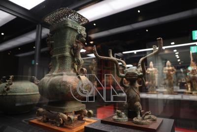 國立歷史博物館經整修將在21日起開放公眾參觀,常設展「在這裡,與大家相遇」共展出典藏文物110件,包含戰後日本歸還文物「蟠龍方壺」(前左)、「獸型器座」(前右)等。