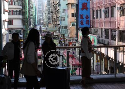 香港政府屋宇署修訂建築物條例後,曾是香港獨特城市風貌的大型霓虹燈招牌陸續因建築安全疑慮被拆除,這些招牌亦是香港經濟曾盛極一時的證明,如今卻慢慢消失在記憶中。圖為觀光客在旺角人行天橋上駐足拍照。中央社記者趙世勳攝 113年2月12日