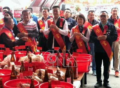 雲林縣崙背鄉24日熱鬧舉辦「元宵擐雞酒」活動,呈現羅厝社區特色民俗文化,客委會主秘廖育珮(前右2)也到場參與,與眾人一同持香參拜。