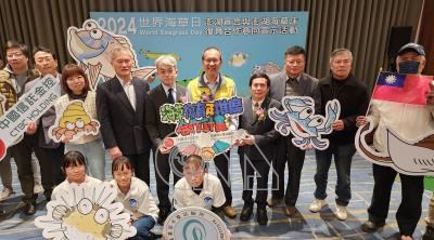 配合世界海草日,農業部水產試驗所1日發表澎湖宣言與簽署澎湖海草床復育及維護合作意向書,在水試所長張錦宜(後右5)見證下,由澎湖漁業生物研究中心主任謝恆毅(後右4)與中國信託金控副總經理林永勝(後右6)合作,以行動保護海草床決心。