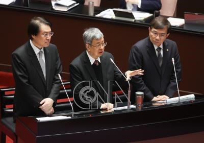 立法院會5日對行政院長陳建仁(中)施政報告繼續質詢,內政部長林右昌(左)、交通部長王國材(右)同台備詢。