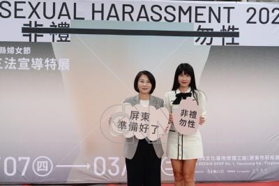 屏東縣政府在婦女節前夕推出「非禮勿性–性平三法宣導特展」,屏東縣長周春米(左)與藝人小嫻(右)7日出席開幕記者會,指出性騷擾最怕冷漠,鼓勵旁觀者介入遏止。