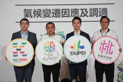 「基北北桃合作交流平台」市長層級會議15日在台北市舉行,基隆市長謝國樑(左起)、新北市長侯友宜、台北市長蔣萬安與桃園市長張善政出席,分別拿各市市徽合影。