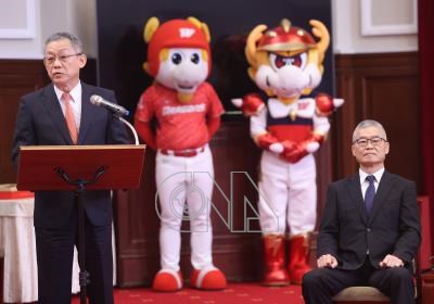 總統蔡英文、副總統賴清德21日在總統府接見2023年中華職棒冠軍隊伍味全龍隊,共享棒球股份有限公司董事長徐文芳(左)致詞。右為中職秘書長楊清瓏。