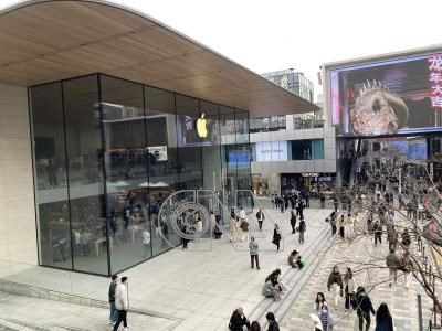 美國蘋果公司(Apple)執行長庫克(Tim Cook)23現身北京三里屯蘋果旗艦店,吸引「果粉」前來朝聖。圖為北京三里屯蘋果旗艦店。