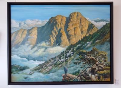畫家王德合2018年從嘉義高中退休後登覽50餘座台灣百岳,美麗山林感動與滋養了他的心靈,畫出壯闊中央山脈與蒼勁高山古木。圖為油畫「春望玉山東峰」。