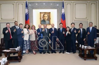 立法院長韓國瑜(右6)、副院長江啟臣(右5)3日接見及款宴「英國工黨國會議員訪問團」,與英國工黨台灣之友會共同主席暨影子商業與貿易副大臣梁辛尼勛爵(Lord Leong)(左7)等訪團成員合影。