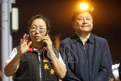 花蓮近海3日上午發生芮氏規模7.2地震,市區多處受災,其中嚴重傾倒的天王星大樓搜救行動一路持續至晚間,花蓮縣長徐榛蔚(右)、國民黨籍立委傅崐萁(左)皆現身救災現場,向搜救隊感謝致意。