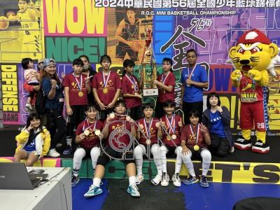 以排灣族為主要族群的台東縣賓茂國小女籃隊(圖)成員非體育班,11日在第56屆全國少年籃球錦標賽大勝屏東縣水泉國小,以5戰全勝之姿奪得U12女子MINI組冠軍,隊職員開心合影。