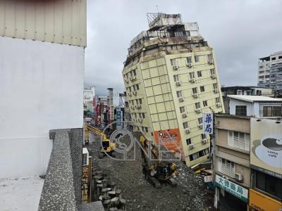 因地震而傾斜倒塌的花蓮市富凱大飯店,影響公共安全,縣府緊急列入拆除,24日持續在建築物周邊填土支撐,增加穩定度,方便機具作業。