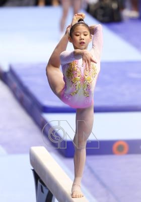 113年全國中等學校運動會24日進行國中女子組競技體操平衡木決賽,台北市民生國中周美(圖)展現優美姿態,順利拿下金牌。