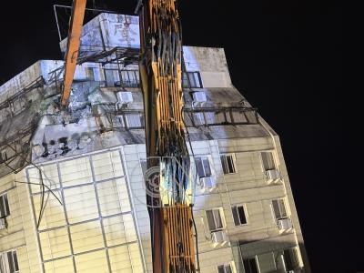 花蓮市富凱大飯店因地震傾斜倒塌,縣府緊急安排拆除,24日晚間8時45分由拆過天王星大樓的「魯夫號」長臂大鋼牙正式開拆,將採24小時不間斷作業。