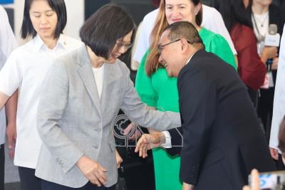 總統蔡英文(前左)25日下午在新北市板橋區出席Google新辦公大樓開幕典禮,與新北市長侯友宜(前右)握手致意。