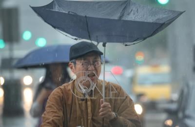 受鋒面影響,台北市區26日中午一度降下大雨、颳起強風,信義區有民眾撐傘走在街頭,手中雨傘被強風吹開了花。