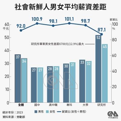 勞動部公布2023年初任人員薪資統計,比較兩性差距,2023年女性初任人員薪資平均3.4萬元,為男性3.7萬元的92%。就各教育程度觀察,研究所女性薪資4.5萬元,為男性5.2萬元的87.1%,差距12.9%為各教育程度之冠。中央社製圖 113年4月30日