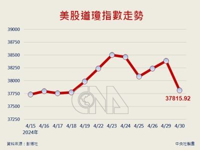 (中央社台北1日電)投資人擔憂美國通貨膨脹僵固,聯邦準備理事會(Fed)將維持高利率更長一段時間,加上美國消費者信心下滑等經濟數據令人失望、美國公債殖利率上揚,美國股市4月30日重挫,道瓊工業指數大跌570.17點。聯準會將公布貨幣政策決定。儘管外界已普遍預期,聯準會結束政策會議時,會將借貸成本維持不變;但市場人士仍將仔細研究會後聯準會將發布的聲明,以及屆時聯準會主席鮑爾(Jerome Powell)發表的談話,以探尋美國央行官員對於今年其餘時間利率計畫的線索。道瓊工業指數大跌570.17點或1.49%,收37815.92點。標準普爾指數大跌80.48點或1.57%,收5035.69點。那斯達克指數重挫325.26點或2.04%,收15657.82點。費城半導體指數重挫92.489點或1.94%,收4673.305點。1130501