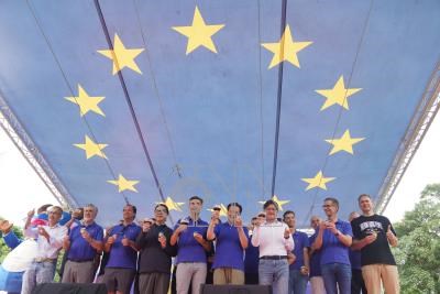 「2024歐洲節」活動4日在台北市華山中央藝文公園舉行,歐洲經貿辦事處長高哲夫(前左5)與外交部長吳釗燮(前左6)等人出席,舉杯慶祝歐盟生日快樂。