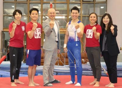 「亞洲貓王」唐嘉鴻(右3)10日在母校台師大舉辦記者會,向媒體分享傷癒復出心路歷程,並和黃金計畫運科團隊體能訓練師陳宜翔(左2)、運動傷害防護員范絜婷(左)、教練翁士航(左3)、黃金計畫主持人陳美燕(右)與負責行政工作的麥劉湘涵(右2)合影。