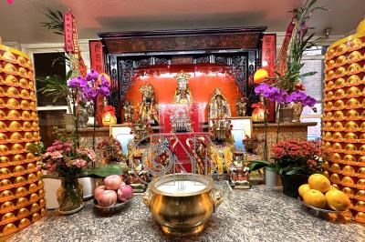 北港媽祖今天抵美,駐駕舊金山朝聖宮。朝聖宮是美國第一間分靈北港媽的廟宇,廟內有大媽(後排中)、二媽(後排右)、三媽(後排左)三尊媽祖神像。