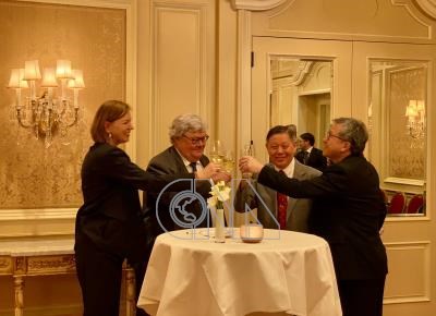 由德國外交部亞太司總司長司佩蘭(Petra Sigmund,左1)倡議的「台德民間論壇」14日於柏林展開兩天會議,圖為德方論壇主席包瑞翰(Reinhard Buetikofer,左2)、台方主席顧忠華(右2)、駐德代表謝志偉(右1)。