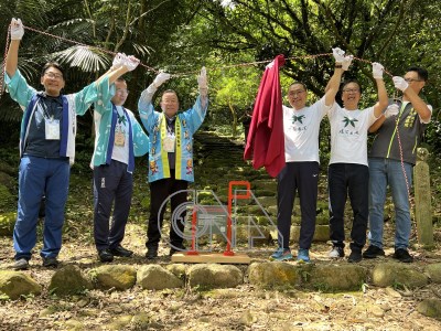 淡蘭古道金字碑古道與日本宮城偶來步道「奧松島路線」締結國際友誼步道,日本宮城縣東松島市長渥美巖(左3)、新北市長侯友宜(右3)等人,19日一同在金字碑古道入口設置宮城縣「偶來小馬」標誌。