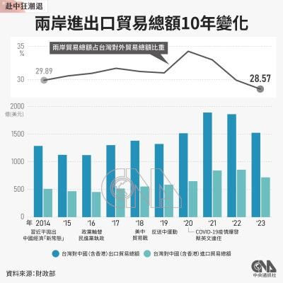 台灣對中國(含香港)貿易總額於對外貿易總額占比,在2015至2021年期間曾連續數年高於3成,2023年降為28.57%,創下10年來新低。中央社製圖 113年5月19日