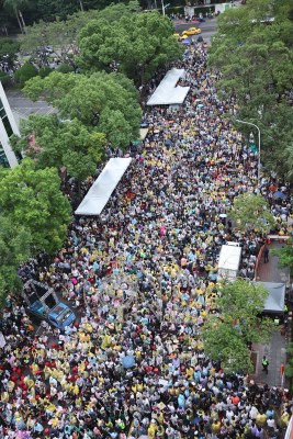 立法院外24日上午起持續湧入大批人潮,共同關注國會職權相關修法審查情形,傍晚自立院高處俯瞰濟南路一帶民眾,人群一路綿延至中山南路側(圖上方)。