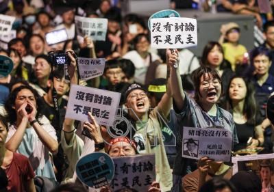 立法院會24日再度挑燈夜戰處理國會職權相關修法,院外抗議修法方晚間8時稱現場達8.5萬人,青島東路上民眾手持寫有「沒有討論 不是民主」的標語表達立場。