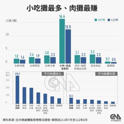 主計總處統計112年6月底攤販計23.3萬攤,以小吃、食品及飲料類攤販12.5萬攤最多,占53.61%。各營業類別中,以生鮮肉類平均每攤營業收入378.9萬元、利潤82.3萬元,居各類別之冠。中央社製圖 113年5月30日