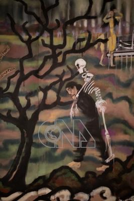 藝術家賽里格(Sylvie Selig)在巨幅油畫「不回頭河」描繪140位藝術家、畫家、雕刻家、設計師、建築師等。圖為畫中人物特寫,向藝術家阿布拉莫維奇(Marina Abramović)致敬。