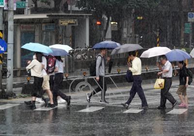 中央氣象署表示,2日各地天氣不穩定,西半部及東北部有陣雨或雷雨,其他地區也有短暫陣雨或雷雨,白天雨勢轉強,各地容易有大雨或局部豪雨。圖為台北市中山區上午下起傾盆大雨,民眾撐傘過馬路。