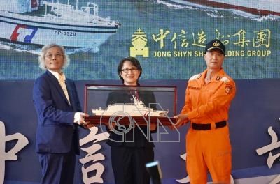 副總統蕭美琴(中)2日上午出席高雄市旗津區中信公司高鼎廠交船典禮,並將永康艦船模交給海巡署艦隊分署南部地區機動海巡隊長呂家富(右),完成交船儀式。左為中信造船股份有限公司董事長韓碧祥。