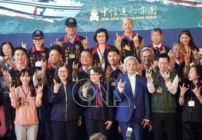 副總統蕭美琴(前排左3)、海洋委員會主委管碧玲(前排左2)、中信造船公司董事長韓碧祥(前排右3)2日至高雄旗津中信公司高鼎廠,出席「永康艦交船、CG611命名下水暨PP-3520艇交船」聯合典禮,與會者一同合影留念。