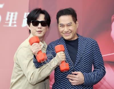 「三金歌王」文章(右)出道40年,10月將首次在台灣北中南3地舉辦大型演唱會,5日在宣傳記者會中與「金曲歌王」蕭煌奇(左)合體亮相,也分享塑身祕訣就是持之以恆的運動。