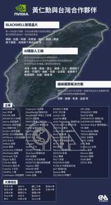 輝達(NVIDIA)執行長黃仁勳2日在台大體育館發表主題演講,背板列出多家供應鏈廠商,以及17所與輝達有合作關係的公私立大學名單。台灣合作夥伴依研發項目分類。中央社製圖 113年6月3日