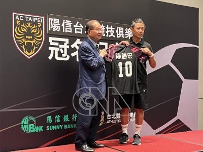 台北競技俱樂部獲得陽信銀行贊助,總教練陳信安(右)13日表示,未來除了在台灣企業甲級足球聯賽持續爭取佳績外,也會持續發展各級青訓,培養更多優秀足球員。