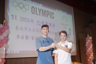 取得2024巴黎奧運資格的台灣羽球混雙組合葉宏蔚(左)、李佳馨(右)15日回到母校台北市立大同高中,與學弟妹分享心路歷程。