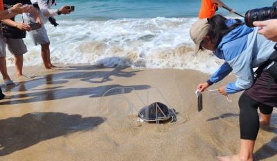 澎湖縣政府農漁局配合世界海龜日,16日在嵵裡沙灘野放今年救護收容的海龜。中央社 113年6月16日