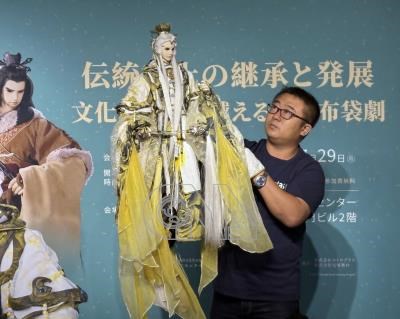 文化部駐日台灣文化中心與霹靂國際多媒體合辦的「傳承與創新-霹靂布袋戲跨界IP展」20日起在台灣文化中心登場,開場由操偶師演繹各類型戲偶,還操縱有半人高的素還真與來賓致意。