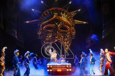 百老匯音樂劇「西貢小姐」將登上台北國家戲劇院,21日彩排演出精采橋段,新版本保留劇中工程師幻想美國夢時搭上豪華車輛登場,背景是巨大自由女神像,舞台場景逼真且華麗。