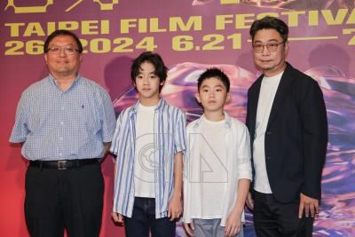 2024台北電影節開幕片「乒乓男孩」21日在中山堂舉行星光首映記者會,導演洪伯豪(右)、製片唐在揚(左)率片中童星彭裕愷(左2)、李星緯(右2)出席。