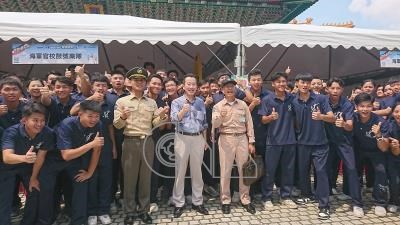 國防部長顧立雄6日出席國防部第7屆全國高級中等學校「愛國儀級棒」儀隊決賽,賽前與參與表演學生合影。
